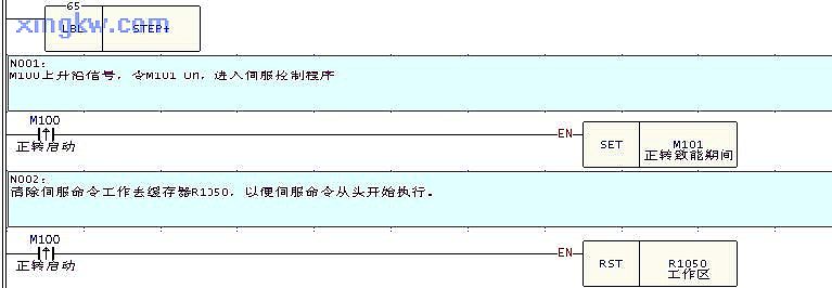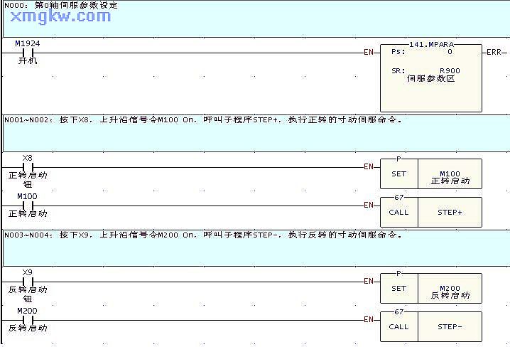 在自動倉儲系統(tǒng)或者高樓電梯控制的應用中,常有伺服寸動的動作要求。我們將伺服寸動寫成子程序,方便調(diào)用。例如正轉(zhuǎn)的副程式為 STEP+,反轉(zhuǎn)為 STEP-。